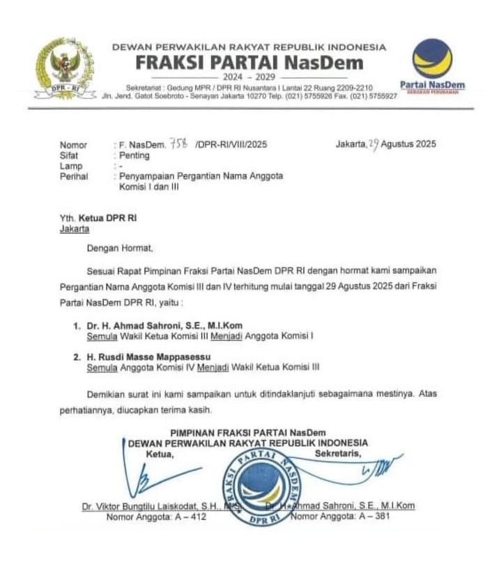 Surat penggantian Sahroni dari pimpinan Komisi III DPR beredar di kalangan wartawan, Jumat(29/8/2025). Surat itu bernomor F.NasDem.758/DPR-RI/VIII/2025.