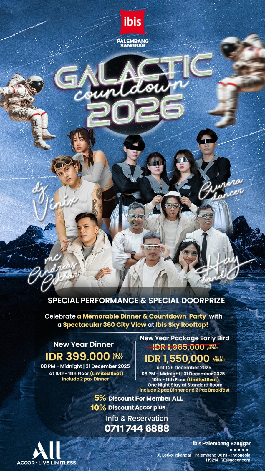 Para tamu juga dapat menikmati berbagai games seru, momen interaktif, serta berkesempatan membawa pulang banjir hadiah sepanjang acara. Sebagai puncak malam, ibis Palembang Sanggar menyiapkan hadiah utama yang akan diumumkan menjelang detik-detik pergantian tahun—menjadikan “Galactic Countdown 2026” malam penuh kejutan dan kebahagiaan.